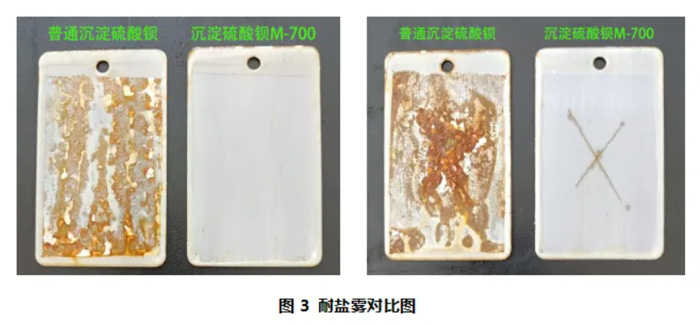 實(shí)驗(yàn)測(cè)試結(jié)果如表3所示。從以上結(jié)果可看出,添加我司沉淀硫酸鋇M-700的漆膜光澤度明顯比添加普通沉淀硫酸鋇的高,且耐沖擊性、柔韌性均高出一個(gè)等級(jí)。分散性與潤(rùn)濕流平性方面,我司沉淀硫酸鋇M-700不但好分散,還具有一定的潤(rùn)濕助磨功效,可有效提高漆膜的流平性。3.2 耐鹽霧性測(cè)試
