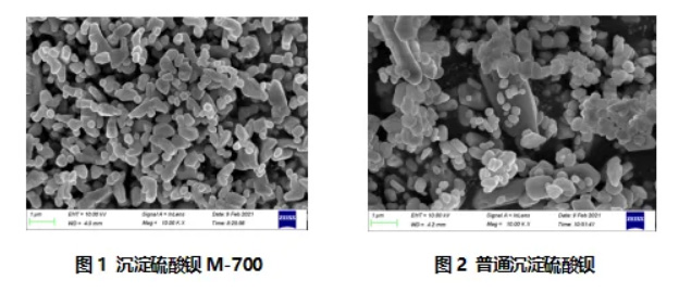 表1是本報(bào)告研究的沉淀硫酸鋇M-700與普通沉淀硫酸鋇的物性對(duì)比表。另外,從圖1、圖2可看到沉淀硫酸鋇M-700與普通沉淀硫酸鋇的電鏡圖差異。